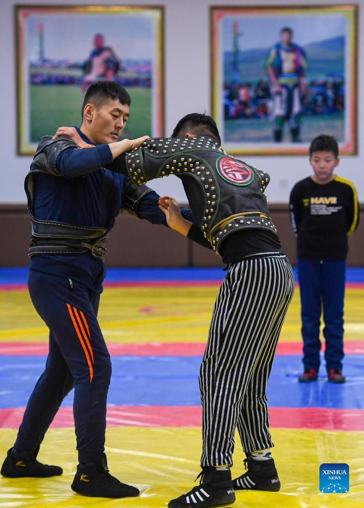 Students learn Mongolian wrestling, or "Boke" in Chinese, during their extra-curricular hours at a middle school in Xilinhot City in north China's Inner Mongolia Autonomous Region, on Nov. 26, 2021. Extra-curricular activities aim to meet the needs of different students and promote their healthy development. (Xinhua/Peng Yuan)
