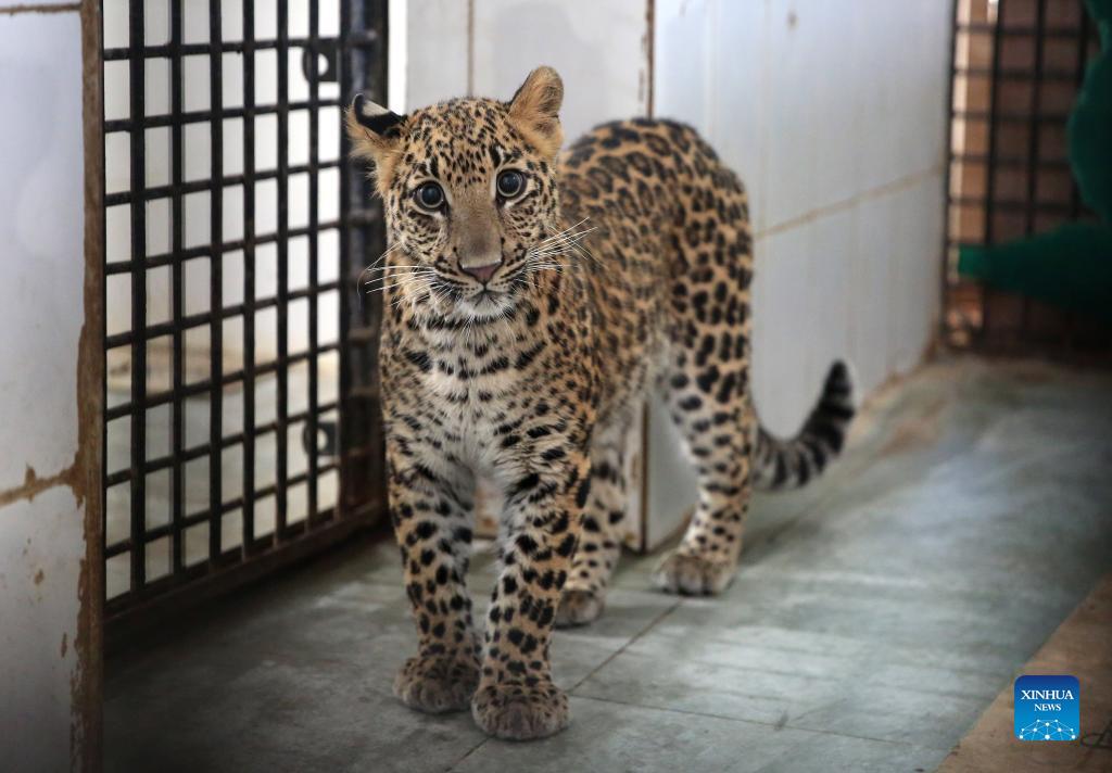A six-month-old leopard is seen at a care center in Van Vihar National Park in Bhopal, capital of India's Madhya Pradesh state, Nov. 27, 2021. This feline cub had been left behind by its mother in a jungle before villagers found it and sent it to the Van Vihar National Park. (Str/Xinhua)