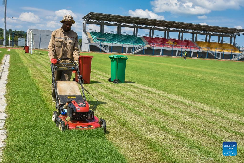 A worker mows the lawn at Bafoussam Omnisport Stadium in Bafoussam, the West Region, Cameroon, on Nov. 18, 2021. (Photo by Kepseu/Xinhua)