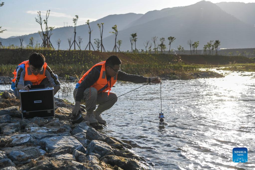 Staff members put a camera in the water to monitor the fishway of auxiliary dam in Nanmu River, which is part of the Dateng Gorge water conservancy project, in Guiping, south China's Guangxi Zhuang Autonomous Region, Nov. 26, 2021. The hydropower project is built on the area which is an important fish habitat due to its complex flow conditions. A rare dual fishway design for both the main dam and the auxiliary dam was therefore put forward at the very beginning of the construction, looking like an artificial passageway for migrating fishes. (Xinhua/Cao Yiming)