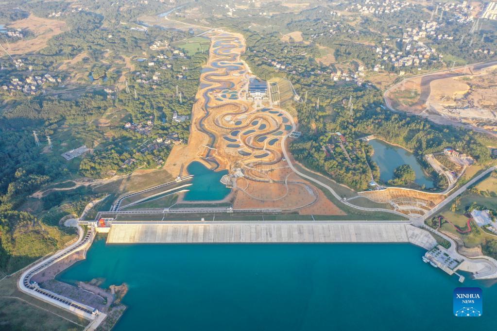 Aerial photo taken on Nov. 26, 2021 shows the fishway of auxiliary dam in Nanmu River and the fish proliferation and release station of the Dateng Gorge water conservancy project in Guiping, south China's Guangxi Zhuang Autonomous Region. The hydropower project is built on the area which is an important fish habitat due to its complex flow conditions. A rare dual fishway design for both the main dam and the auxiliary dam was therefore put forward at the very beginning of the construction, looking like an artificial passageway for migrating fishes. (Xinhua/Cao Yiming)