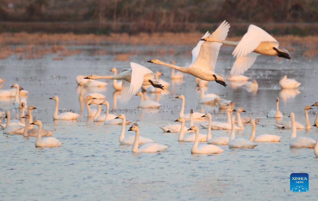 Little swans are seen at the Donggu Lake wetland of the Quyuan administration area in Yueyang City, central China's Hunan Province, Nov. 26, 2021. About 3,000 little swans have arrived at the Donggu Lake wetland of the Quyuan administration area in Yueyang for wintering. (Photo by Cao Zhengping/Xinhua)