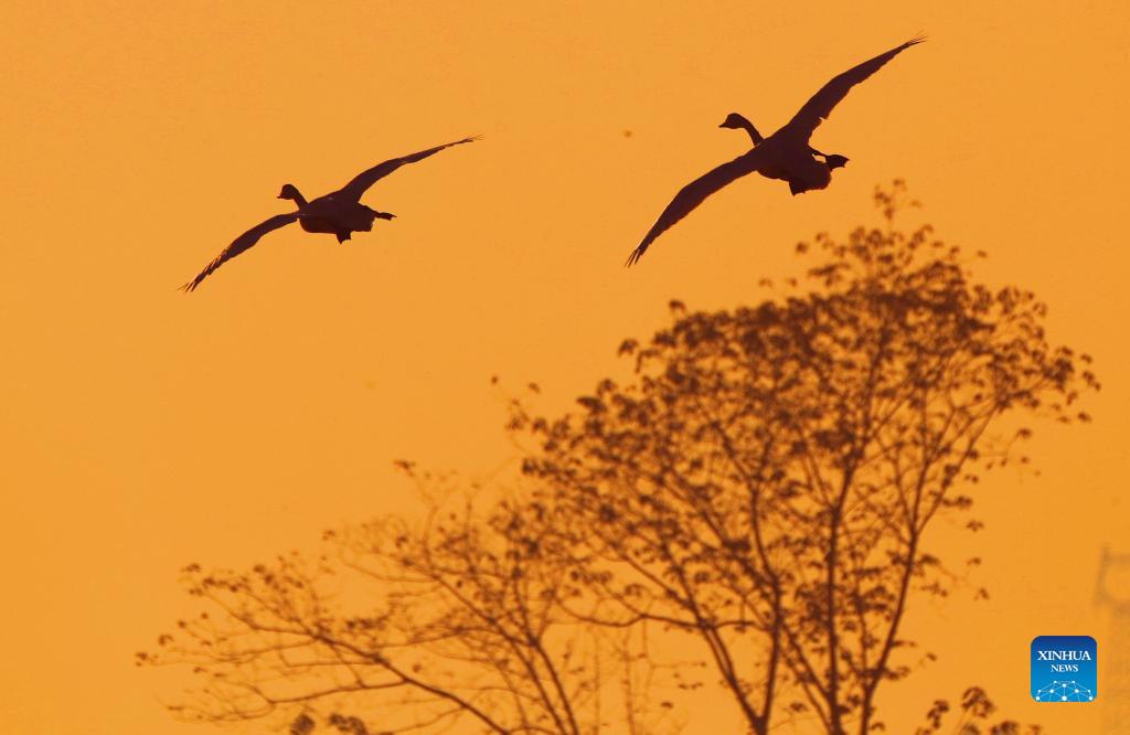 A flock of little swans fly in the sky over the Donggu Lake wetland of the Quyuan administration area in Yueyang City, central China's Hunan Province, Nov. 27, 2021. About 3,000 little swans have arrived at the Donggu Lake wetland of the Quyuan administration area in Yueyang for wintering. (Photo by Cao Zhengping/Xinhua)