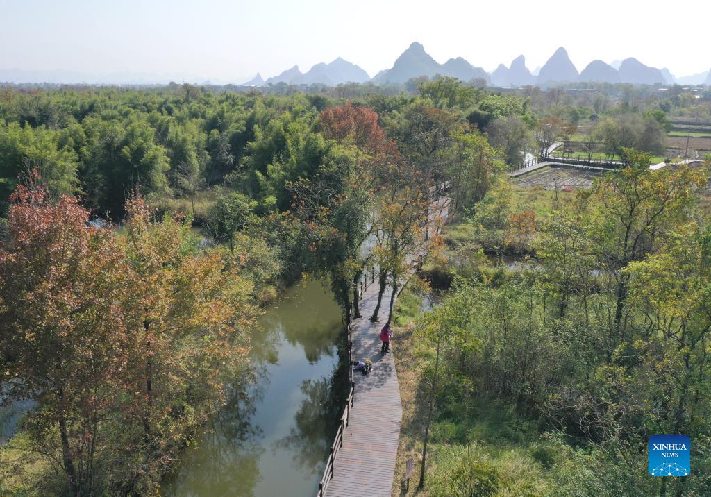 Aerial photo taken on Nov. 27, 2021 shows the winter scenery of the Huixian Wetlands in Guilin, south China's Guangxi Zhuang Autonomous Region. (Xinhua/Zhou Hua)