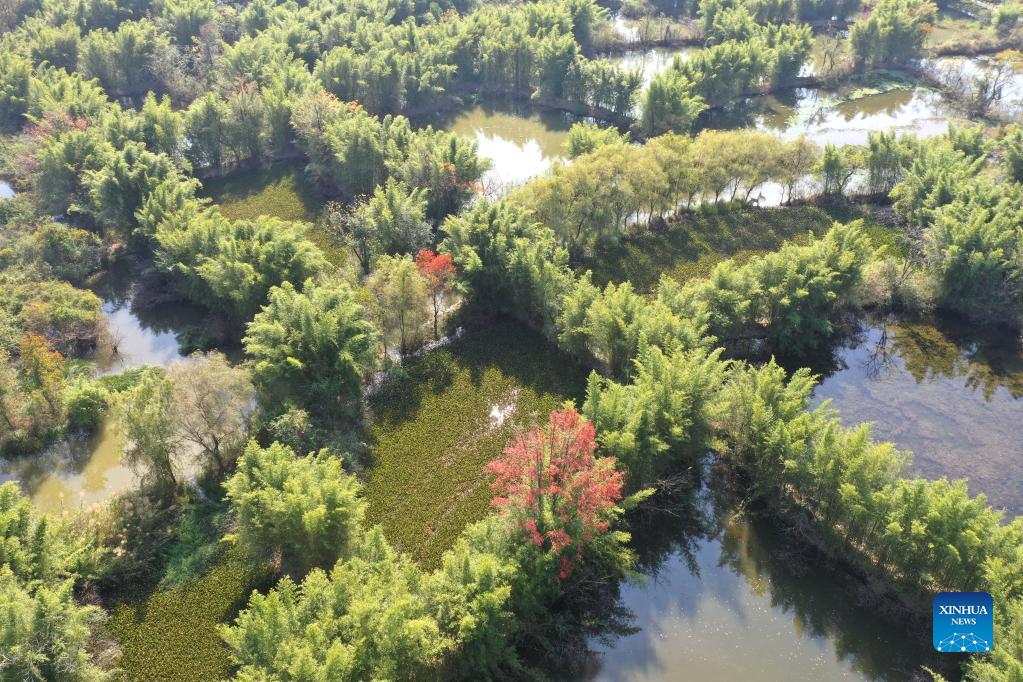 Aerial photo taken on Nov. 27, 2021 shows the winter scenery of the Huixian Wetlands in Guilin, south China's Guangxi Zhuang Autonomous Region. (Xinhua/Zhou Hua)