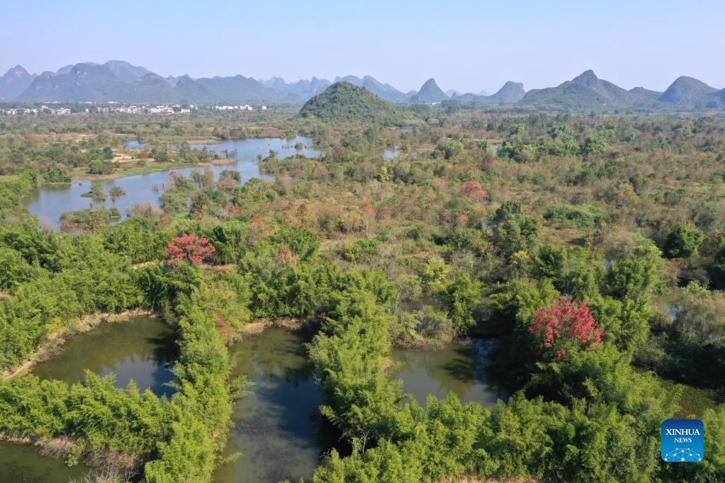 Aerial photo taken on Nov. 27, 2021 shows the winter scenery of the Huixian Wetlands in Guilin, south China's Guangxi Zhuang Autonomous Region. (Xinhua/Zhou Hua)