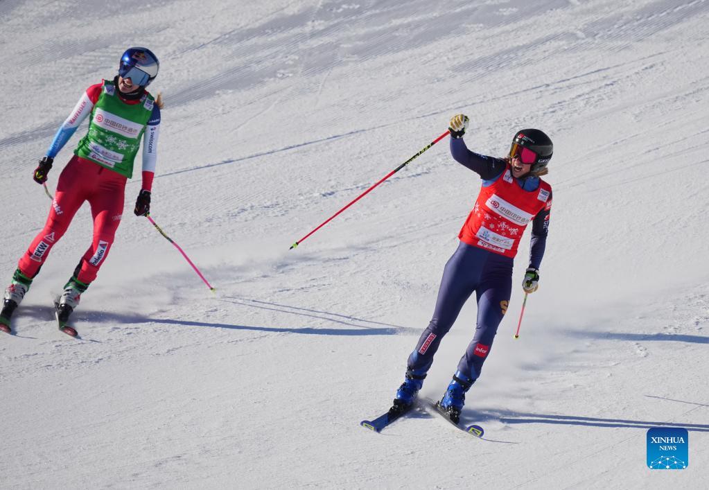 Sweden's Sandra Naeslund (R) celebrates after winning the women's ski cross final at the FIS Ski World Cup in Chongli, north China's Hebei Province, Nov. 27, 2021. (Xinhua/Yang Shiyao)