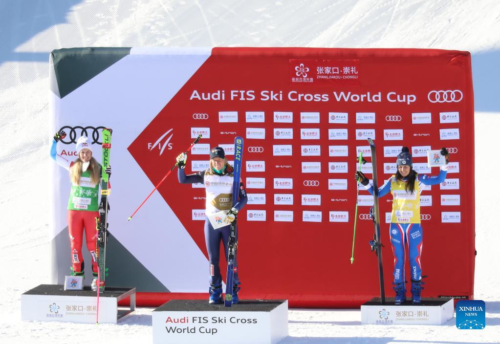Gold medalist Sweden's Sandra Naeslund (C), silver medalist Switzerland's Fanny Smith (L) and bronze medalist France's Marielle Berger Sabbatel pose on the podium during the awarding ceremony of the women's ski cross final at the FIS Ski World Cup in Chongli, north China's Hebei Province, Nov. 27, 2021. (Xinhua/Yang Shiyao)