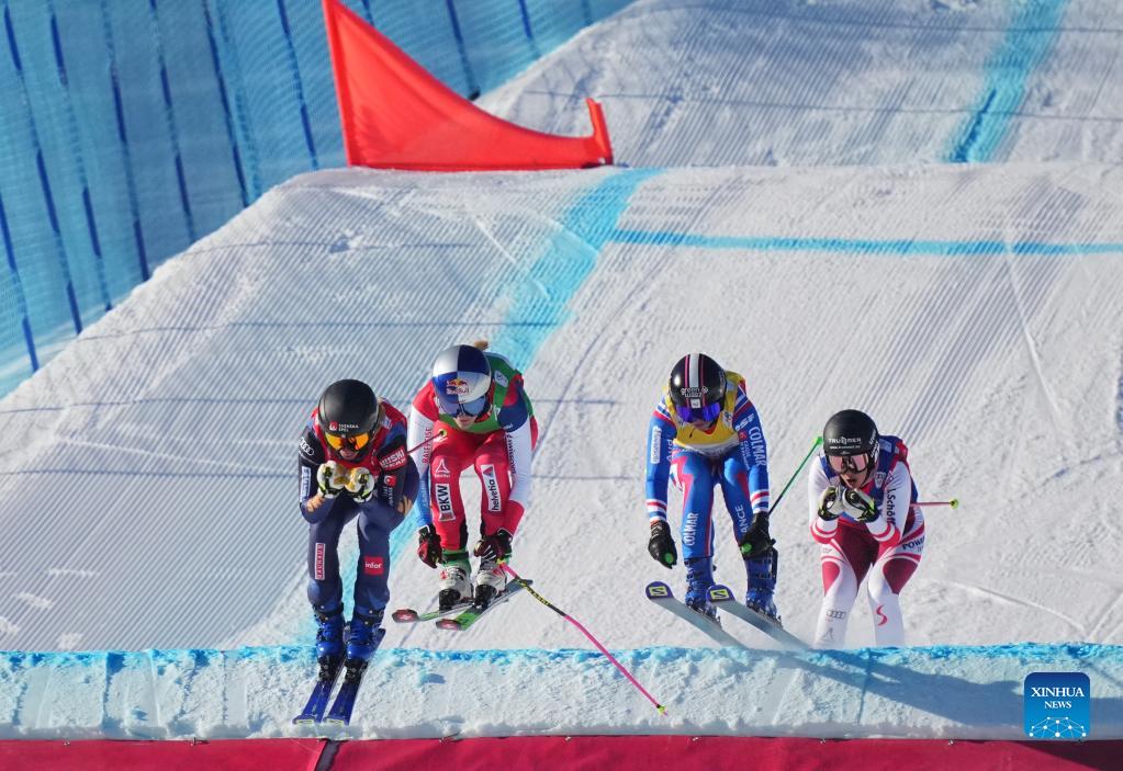 Sweden's Sandra Naeslund (1st L), Switzerland's Fanny Smith (2nd L), France's Marielle Berger Sabbatel (2nd R) compete during the women's ski cross final at the FIS Ski World Cup in Chongli, north China's Hebei Province, Nov. 27, 2021. (Xinhua/Yang Shiyao)