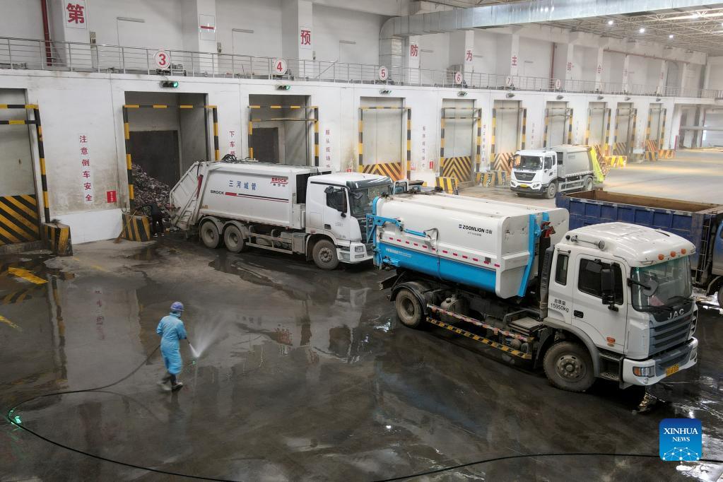 Aerial photo shows household waste dumped into the storage space of a power plant in Feixi County of Hefei, east China's Anhui Province, Nov. 23, 2021. The power plant in Feixi County has been burning household waste to generate electricity. The power plant uses approximately 730,000 tonnes of domestic waste each year and creates some 230 million kWh of electricity. (Xinhua/Huang Bohan)