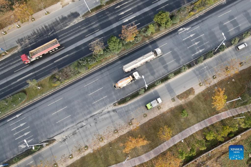 Aerial photo shows a garbage truck carring household waste to a power plant in Feixi County of Hefei, east China's Anhui Province, Nov. 23, 2021. The power plant in Feixi County has been burning household waste to generate electricity. The power plant uses approximately 730,000 tonnes of domestic waste each year and creates some 230 million kWh of electricity. (Xinhua/Huang Bohan)