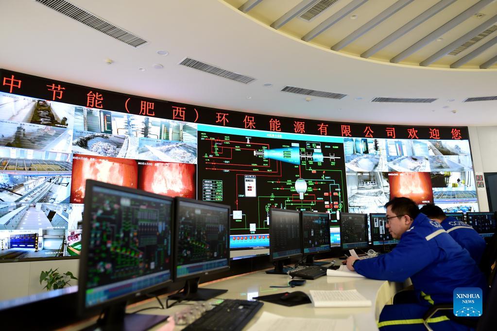 Staff members monitor the power generation system in a power plant in Feixi County of Hefei, east China's Anhui Province, Nov. 23, 2021. The power plant in Feixi County has been burning household waste to generate electricity. The power plant uses approximately 730,000 tonnes of domestic waste each year and creates some 230 million kWh of electricity. (Xinhua/Huang Bohan)