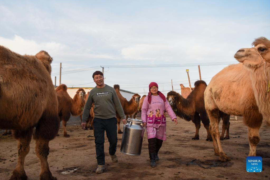 Breeders transfer fresh camel milk in Fuhai County of Altay, northwest China's Xinjiang Uygur Autonomous Region, Nov. 24, 2021. Fuhai, located in north Xinjiang, is an important stock farming base in the region, with unique geographical and climatic conditions especially suitable for camel breeding. In recent years, camel breeding has developed into a pillar industry under promotion policy in Fuhai. By establishing camel milk cooperatives, individual herders here are accessing the dairy market through unified and stable sales channels. In 2021, the number of camels in the county has totaled 22,300, among which 6,470 are dairy camels with a daily milk output of 12,500 kilograms. (Xinhua/Ding Lei)