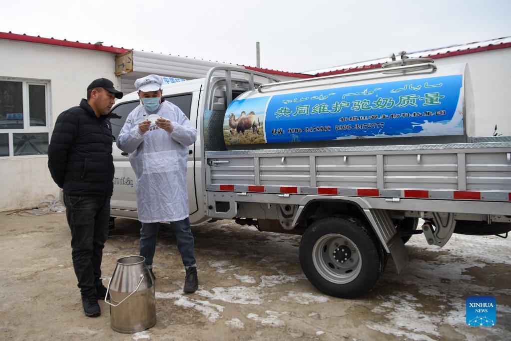A milk collector checks camel milk quality in Fuhai County of Altay, northwest China's Xinjiang Uygur Autonomous Region, Nov. 26, 2021. Fuhai, located in north Xinjiang, is an important stock farming base in the region, with unique geographical and climatic conditions especially suitable for camel breeding. In recent years, camel breeding has developed into a pillar industry under promotion policy in Fuhai. By establishing camel milk cooperatives, individual herders here are accessing the dairy market through unified and stable sales channels. In 2021, the number of camels in the county has totaled 22,300, among which 6,470 are dairy camels with a daily milk output of 12,500 kilograms. (Xinhua/Ding Lei)