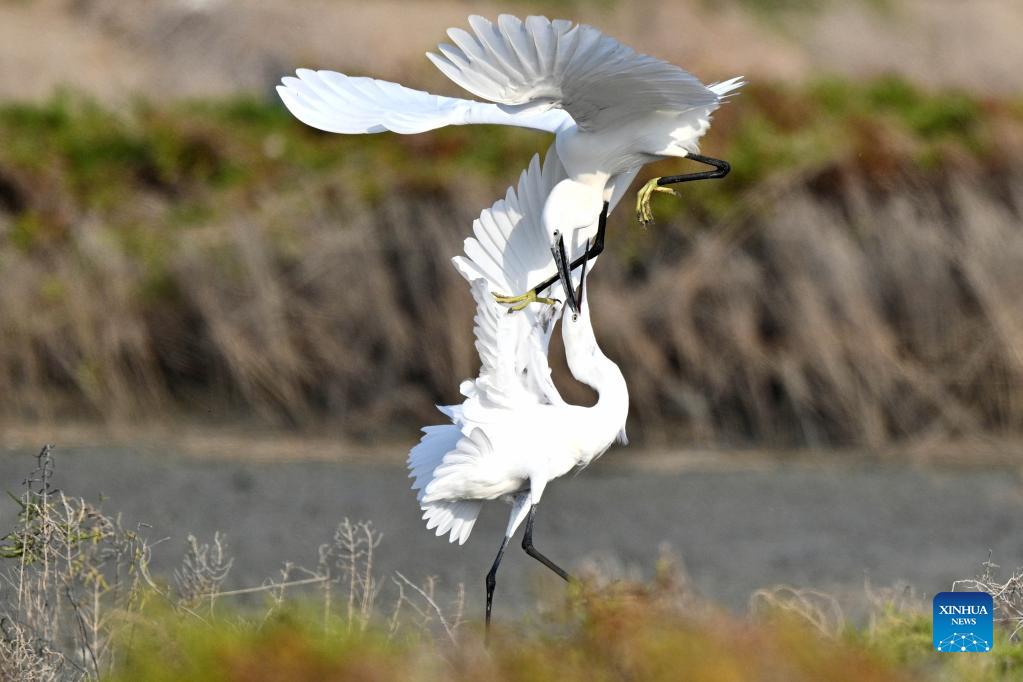 Little egrets fight for food at a beach in Jahra Governorate, Kuwait, Nov. 26, 2021. (Photo by Ghazy Qaffaf/Xinhua)