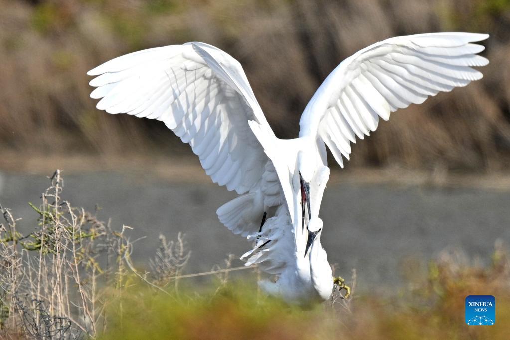 Little egrets fight for food at a beach in Jahra Governorate, Kuwait, Nov. 26, 2021. (Photo by Ghazy Qaffaf/Xinhua)