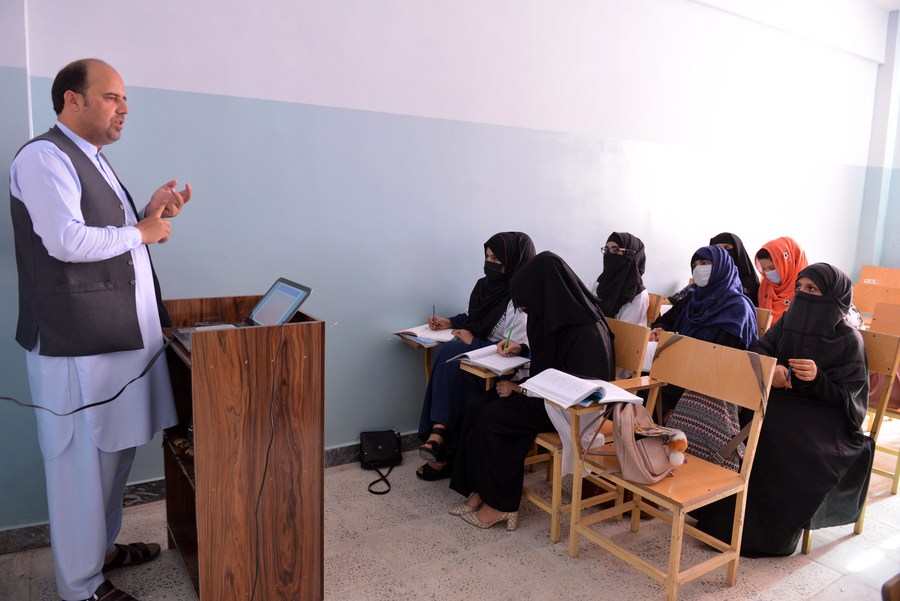 Afghan women attend a class at a university in Kandahar city, southern Afghanistan, Sept. 13, 2021. (Photo by Sanaullah Seiam/Xinhua)