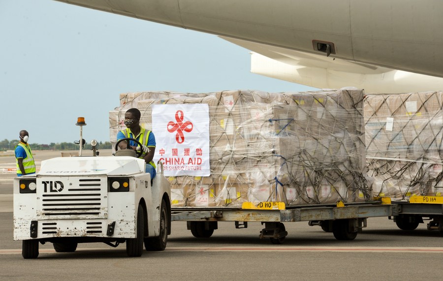 A staff member unloads Chinese medical supplies from an airplane at the Kotota International Airport in Accra, Ghana, April 6, 2020. (Xinhua/Xu Zheng)