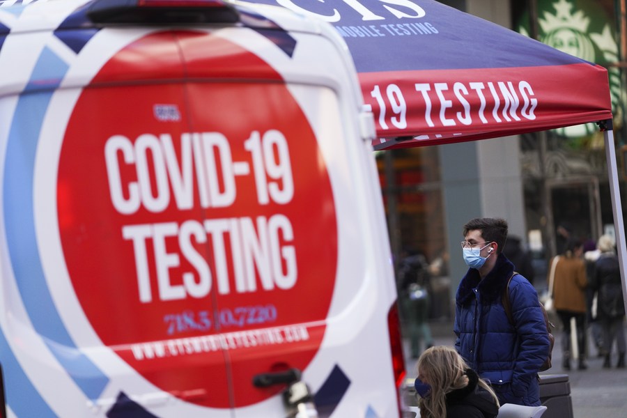 People wait for COVID-19 tests on Times Square in New York, the United States, Nov. 23, 2021. (Xinhua/Wang Ying)