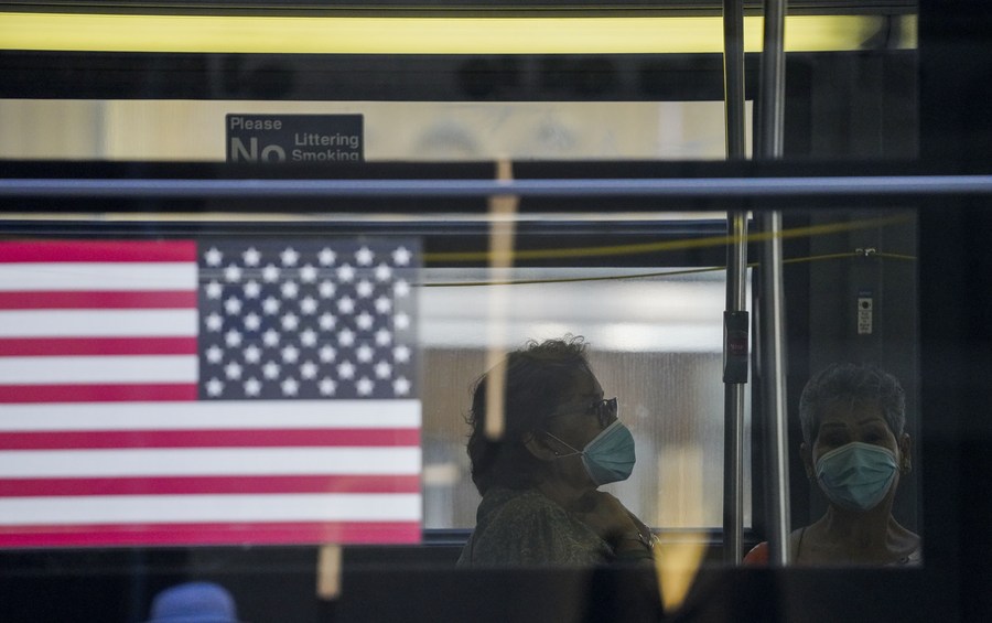 Passengers with face masks are seen in a bus in New York City, the United States, Aug. 2, 2021.(Xinhua/Wang Ying)