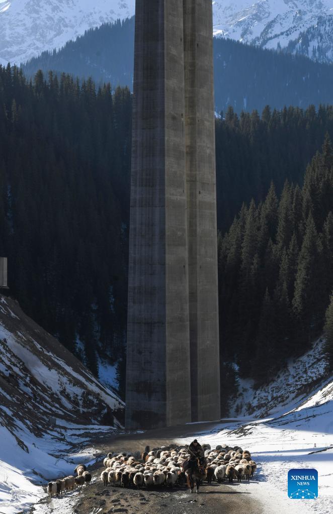 Herders and their livestock pass under the Guozigou Bridge as they head for winter pastures in Huocheng County, northwest China's Xinjiang Uygur Autonomous Region, Nov. 25, 2021. Local herders in Huocheng County are moving their livestock to winter pastures as the weather gets colder. (Xinhua/Zhao Ge)