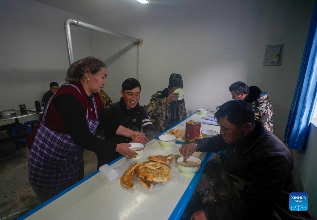 Herders have food at a replenishment site in Huocheng County, northwest China's Xinjiang Uygur Autonomous Region, Nov. 25, 2021. Local herders in Huocheng County are moving their livestock to winter pastures as the weather gets colder. (Xinhua/Zhao Ge)