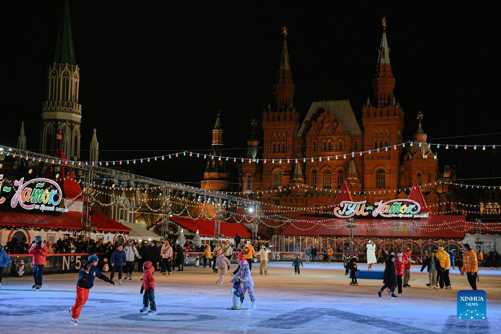 People skate on the GUM ice rink during its opening night in Moscow, Russia, on Nov. 28, 2021. (Xinhua/Evgeny Sinitsyn)