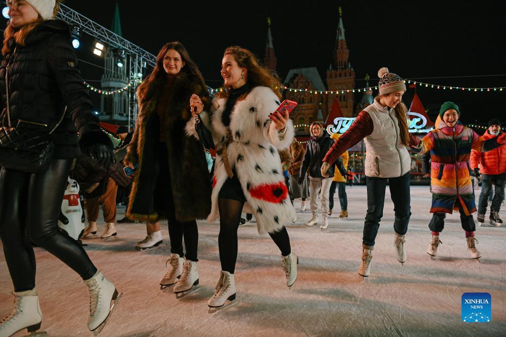 People skate on the GUM ice rink during its opening night in Moscow, Russia, on Nov. 28, 2021. (Xinhua/Evgeny Sinitsyn)