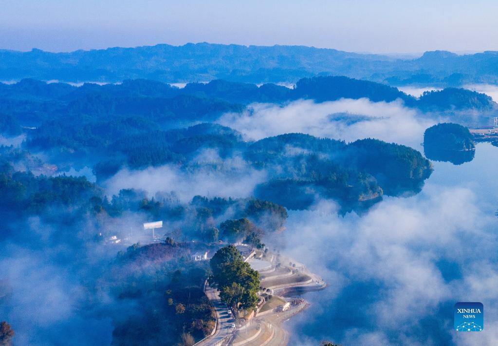 Aerial photo taken on Nov. 25, 2021 shows the scenery of Lixiang Lake National Wetland Park in Nanchuan District, southwest China's Chongqing Municipality. Local authorities of Nanchuan District have in recent years made all-out efforts to strengthen ecological protection of Lixiang Lake. The endeavor has yielded blue skies and clear waters as well as booming tourism. (Photo by Qu Mingbin/Xinhua)