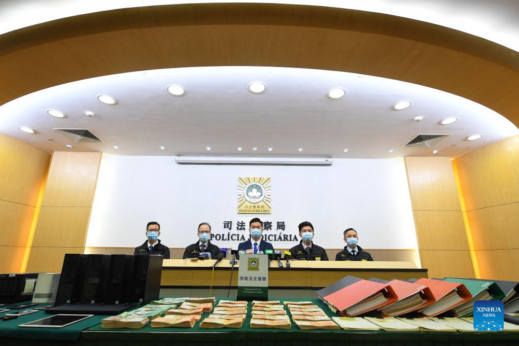 Police in China's Macao Special Administrative Region (SAR) announce the case of gambling crimes at a press conference in Macao, south China, Nov. 28, 2021. Police in China's Macao SAR on Sunday detained 11 people suspected of being involved in illegally running gambling businesses or money laundering, and referred the case to procurators. (Xinhua/Cheong Kam Ka)
