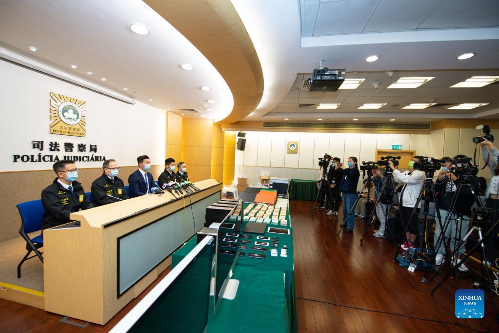 Police in China's Macao Special Administrative Region (SAR) announce the case of gambling crimes at a press conference in Macao, south China, Nov. 28, 2021. Police in China's Macao SAR on Sunday detained 11 people suspected of being involved in illegally running gambling businesses or money laundering, and referred the case to procurators. (Xinhua/Cheong Kam Ka)
