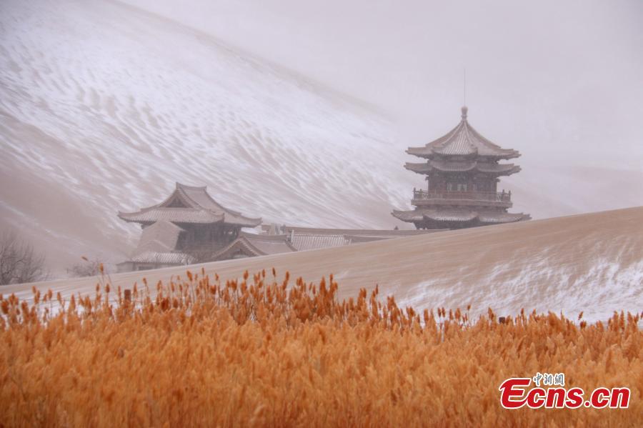 Photo taken on Nov. 28, 2021 shows the snow scenery of Mingsha Mountain and Crescent Spring scenic spot in Dunhuang City, Northwest China's Gansu Province. (Photo: China News Service/Zhang Xiaoliang)