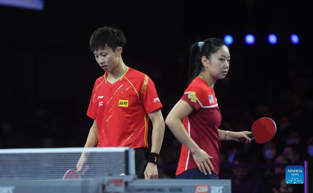 Lin Gaoyuan (L) of China and Lily Zhang of the United States are seen after the mixed doubles semifinal match against Japan's Harimoto Tomokazu/Hayata Hina at 2021 World Table Tennis Championships Finals in Houston, the United States on Nov. 28, 2021. (Xinhua/Wu Xiaoling)