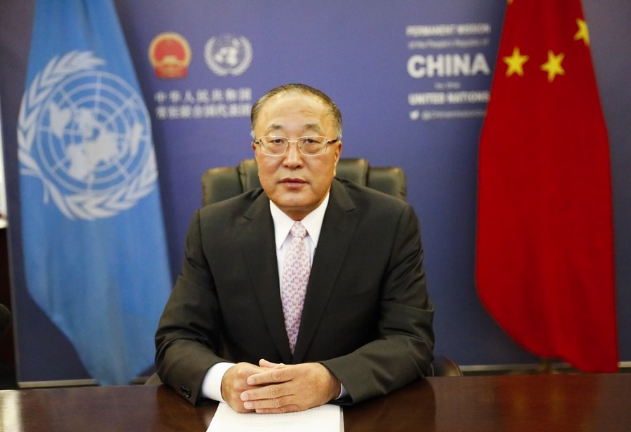 Zhang Jun, China's permanent representative to the UN, speaks via video link at the Third Committee of the 76th session of the United Nations (UN) General Assembly, in New York, Oct. 21, 2021.(China Mission to the UN/Handout via Xinhua)