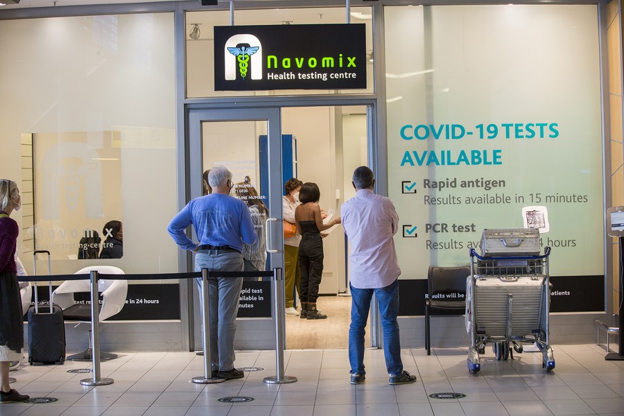 Travelers wait to receive COVID-19 tests at Cape Town International Airport in Cape Town, South Africa, Nov. 29, 2021.(Str/Xinhua)