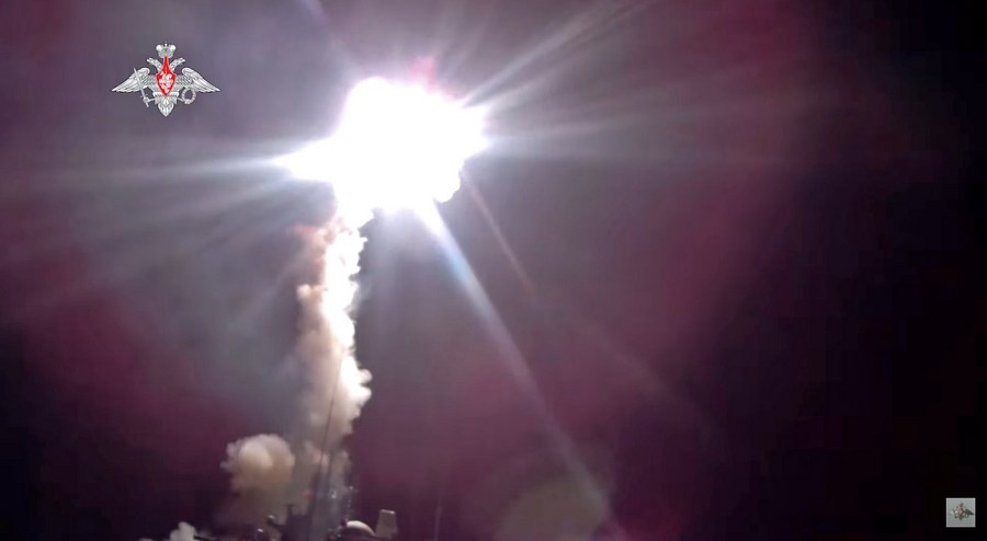 Screengrab from footage released by the Russian Defense Ministry on Nov. 29, 2021 shows the firing of a Tsirkon hypersonic missile from Russian frigate Admiral Gorshkov.