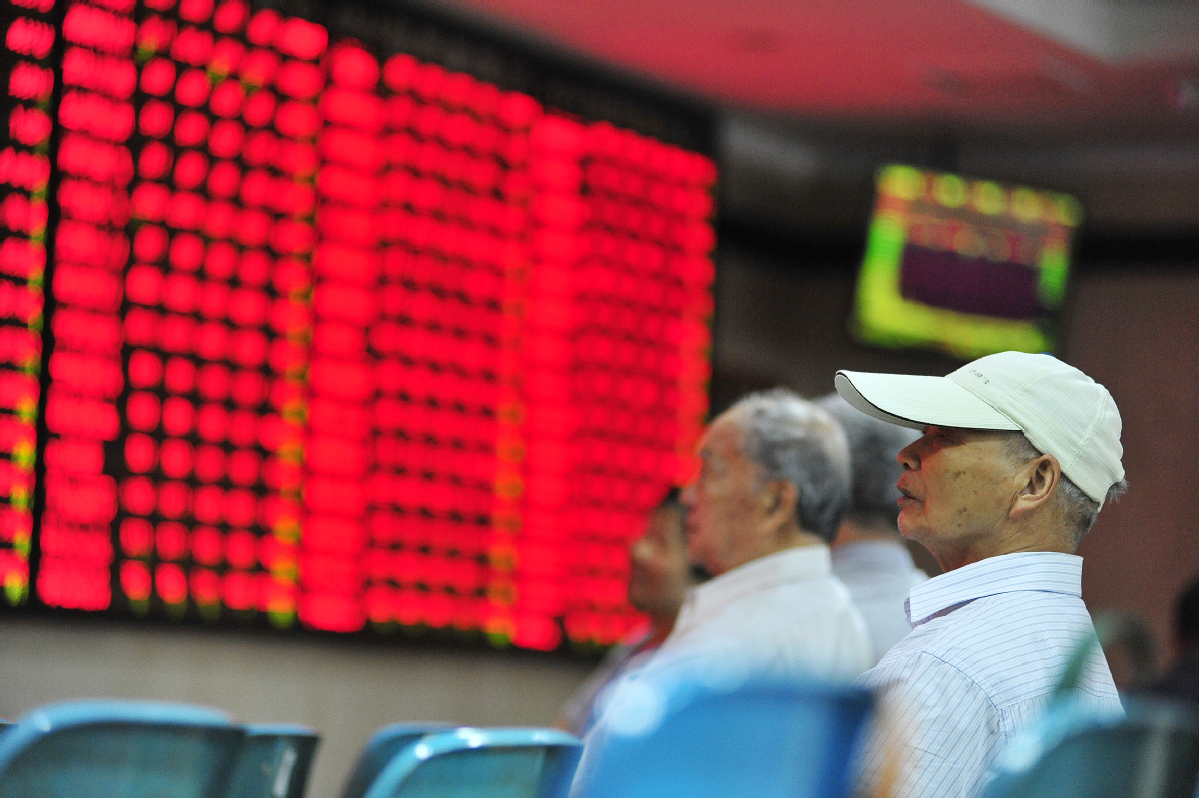 Investors check share prices at a securities firm in Nanjing, Jiangsu province. [Photo by Xing Qu/For China Daily]