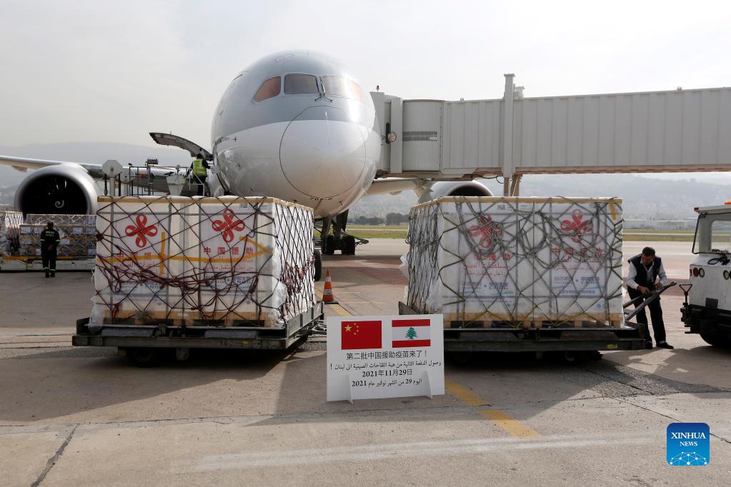 A medical donation from China arrives at an airport in Beirut, Lebanon, on Nov. 29, 2021. Lebanon on Monday received from China a medical donation consisting of a second batch of China's Sinopharm COVID-19 vaccines, 100 ventilators and 100 hospital beds. (Xinhua/Bilal Jawich)