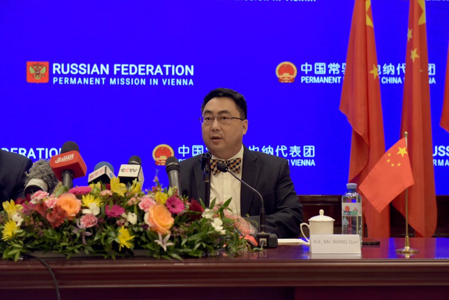 Wang Qun, Chinese envoy to the United Nations and other international organizations in Vienna, attends a press conference on the AUKUS nuclear submarine deal and related non-proliferation issues in Vienna, Austria, Nov. 26, 2021. (Xinhua/Guo Chen)