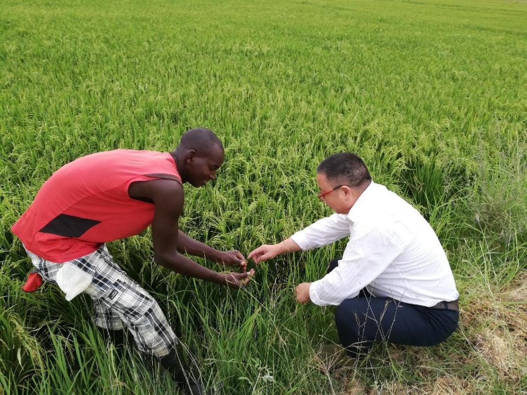 A Chinese agricultural expert offers technical guidance to a local technician in Senegal, June 24, 2019. (Photo provided by the agricultural expert team sent by China to Senegal as an aid to the country’s development)