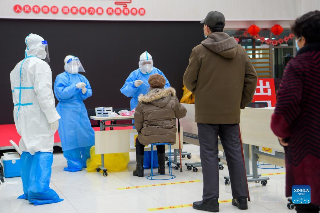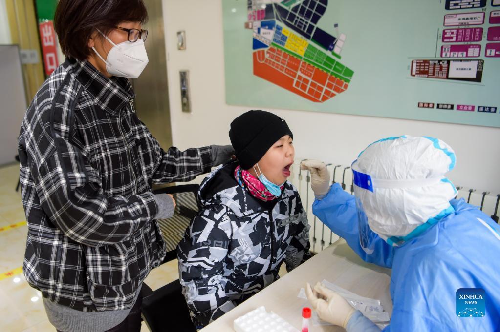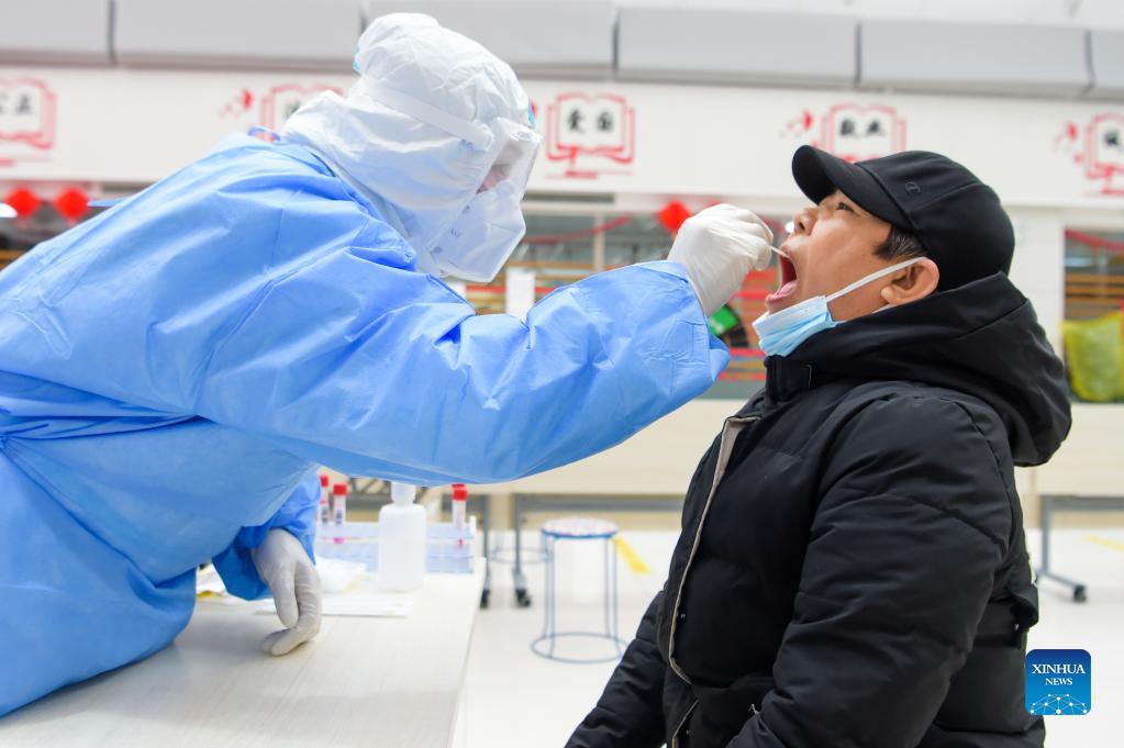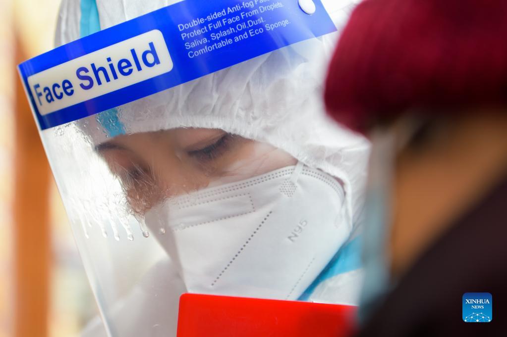 A staff member takes a swab sample from a resident for nucleic acid test at a testing site in Manzhouli, north China's Inner Mongolia Autonomous Region, Nov. 29, 2021. As of 2 p.m. on Monday, Manzhouli had a total of 28 locally transmitted confirmed COVID-19 cases. The second round of citywide nucleic acid testing has begun, and different procedures have been implemented to assure stable material supply. (Xinhua/Li Zhipeng)