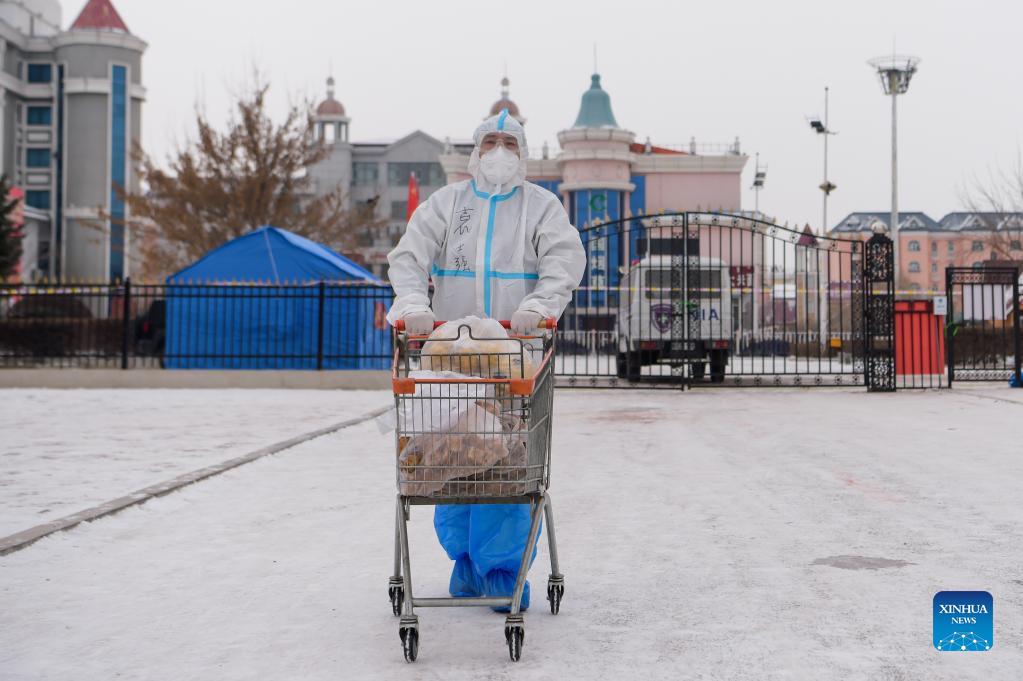 A staff member transfers materials at a residential area in Manzhouli, north China's Inner Mongolia Autonomous Region, Nov. 29, 2021. As of 2 p.m. on Monday, Manzhouli had a total of 28 locally transmitted confirmed COVID-19 cases. The second round of citywide nucleic acid testing has begun, and different procedures have been implemented to assure stable material supply. (Xinhua/Li Zhipeng)