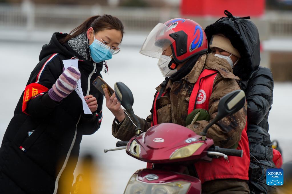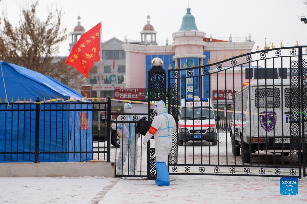 A staff member (L) is on duty at a residential area in Manzhouli, north China's Inner Mongolia Autonomous Region, Nov. 29, 2021. As of 2 p.m. on Monday, Manzhouli had a total of 28 locally transmitted confirmed COVID-19 cases. The second round of citywide nucleic acid testing has begun, and different procedures have been implemented to assure stable material supply. (Xinhua/Li Zhipeng)