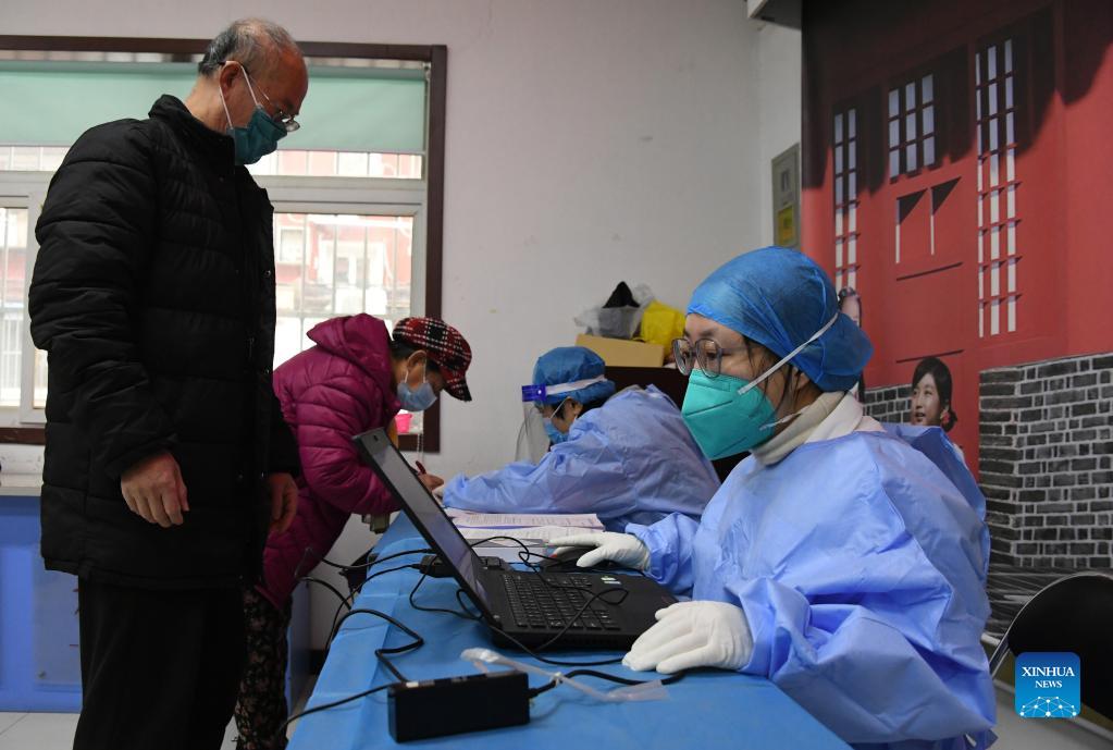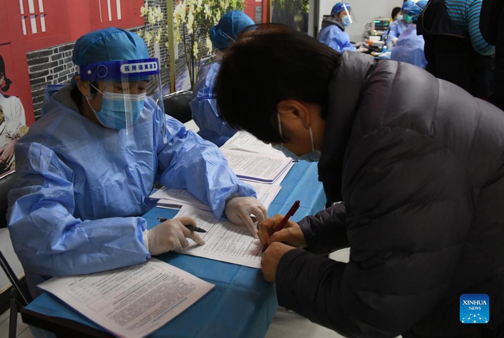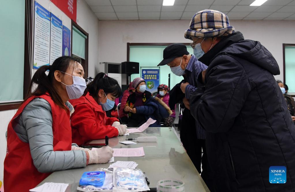 Medical workers register local residents before they receive booster shots of COVID-19 vaccines at a temporary vaccination site in Beijing, capital of China, Nov. 29, 2021. (Xinhua/Ren Chao)