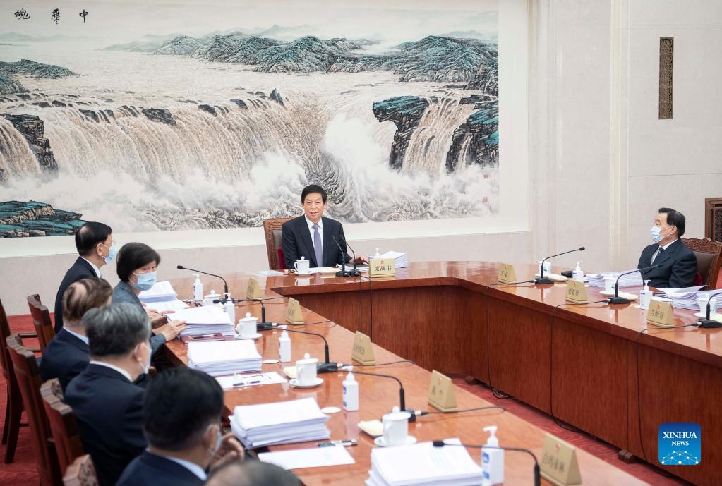 Li Zhanshu, chairman of the National People's Congress (NPC) Standing Committee, presides over the 106th meeting of the Council of Chairpersons of the 13th NPC Standing Committee at the Great Hall of the People in Beijing, capital of China, Nov. 29, 2021. (Xinhua/Li Tao)