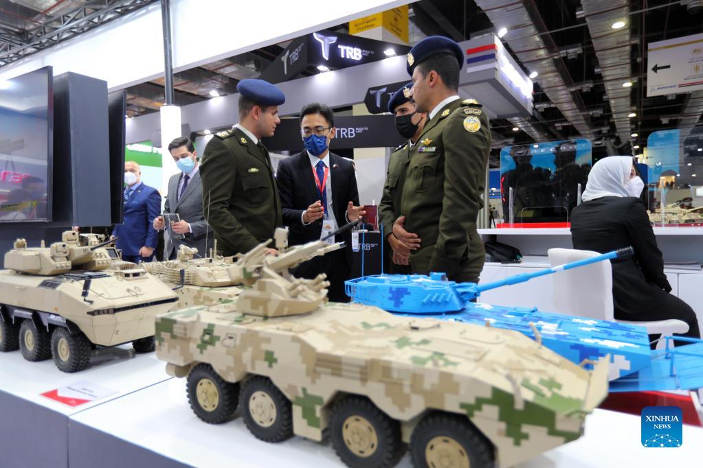An exhibitor of China North Industries Group Corporation Limited introduces exhibits to visitors during an international defense expo in Cairo, Egypt, on Nov. 29, 2021. Egypt held on Monday the second edition of its largest international defense expo, EDEX 2021, with more than 400 defense companies from 42 countries, including China, showcasing their up-to-date defense products. (Xinhua/Sui Xiankai)