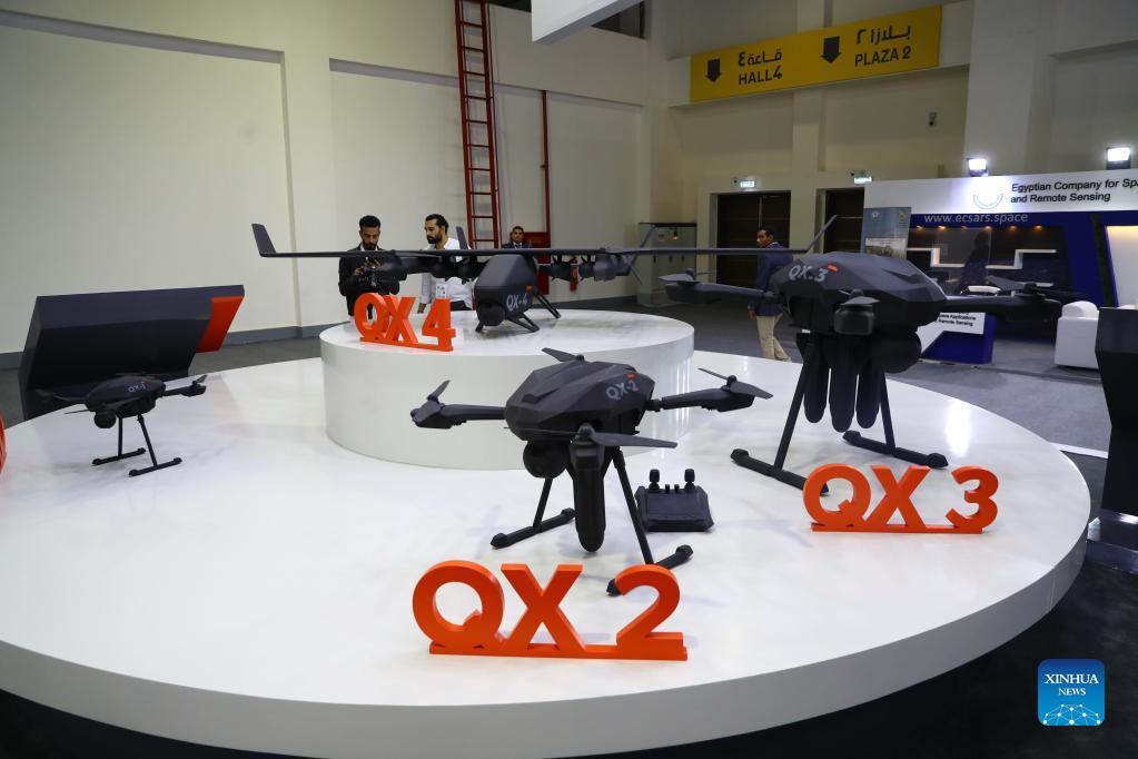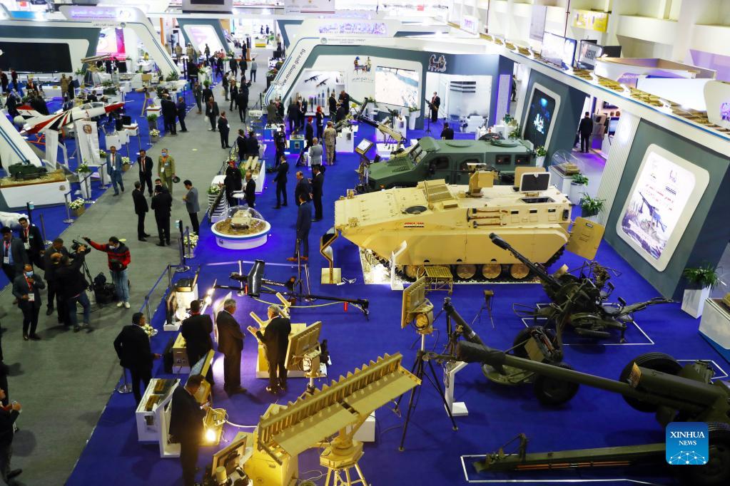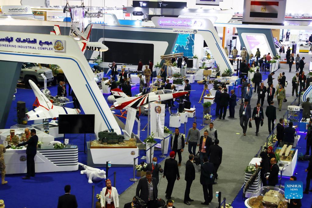 People visit the Egypt's exhibition area during an international defense expo in Cairo, Egypt, on Nov. 29, 2021. Egypt held on Monday the second edition of its largest international defense expo, EDEX 2021, with more than 400 defense companies from 42 countries, including China, showcasing their up-to-date defense products. (Xinhua/Ahmed Gomaa)