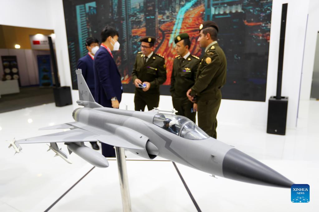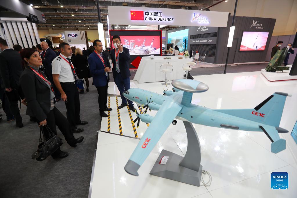 People stand near a model of ZDK-03 AWACS Aircraft at the booth of China Electronics Technology Group during an international defense expo in Cairo, Egypt, on Nov. 29, 2021. Egypt held on Monday the second edition of its largest international defense expo, EDEX 2021, with more than 400 defense companies from 42 countries, including China, showcasing their up-to-date defense products. (Xinhua/Sui Xiankai)