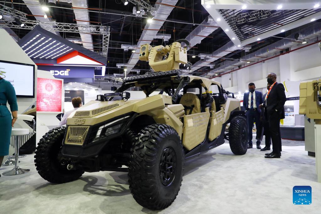 People visit the United Arab Emirates' exhibition area during an international defense expo in Cairo, Egypt, on Nov. 29, 2021. Egypt held on Monday the second edition of its largest international defense expo, EDEX 2021, with more than 400 defense companies from 42 countries, including China, showcasing their up-to-date defense products. (Xinhua/Ahmed Gomaa)