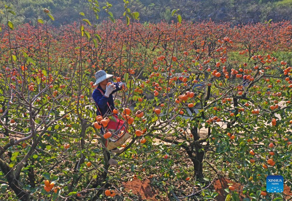 A villager picks persimmons in Gongcheng Yao Autonomous County, south China's Guangxi Zhuang Autonomous Region, Nov. 29, 2021. Persimmons are in season here and the fruit is ripe on the branches. Village workers are busy picking and drying the fruit. (Xinhua/Zhou Hua)